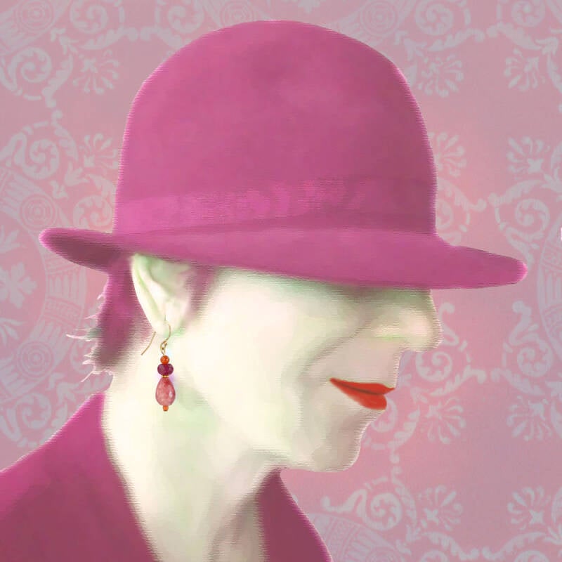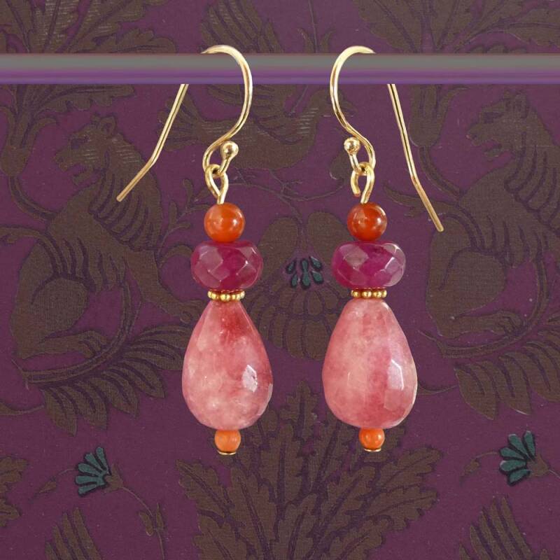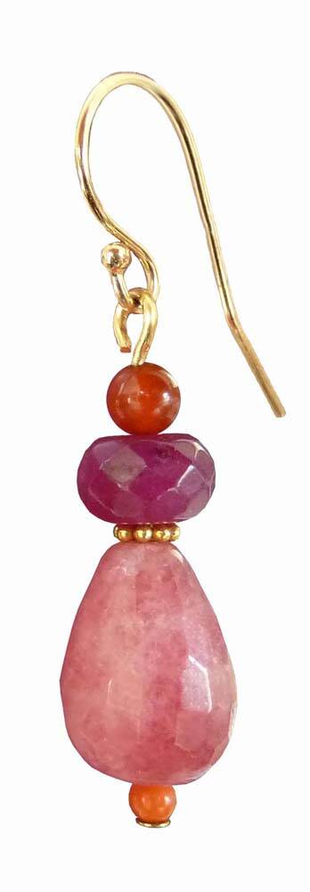 O lala, wat zien we daar? Oh Lola! Ondeugend, zoet, exotisch, vrolijk, levenslustig. Kortom: je wordt blij van deze oorbellen. De roze druppel is facetgeslepen cherry quarts met daar bovenop een snoeperige dieproze facetgeslepen jade rondel en een pittig carneooltje. En het piepkleine bloedkoraaltje aan de onderkant zit er beslist niet voor niks. Het lacht je tegemoet. De metalen onderdelen van deze oorbel zijn verguld en de lengte is 4,7 cm.