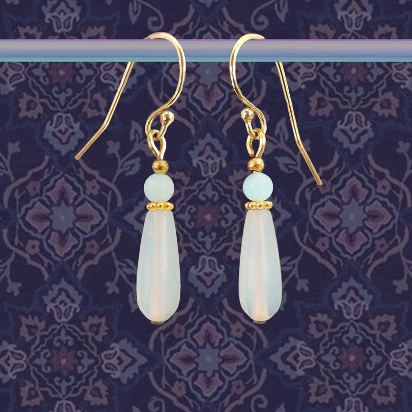 Deze lieve luchtige bel past uitstekend bij een klassieke outfit; niet te groot, niet te uitbundig, niet te onverwacht, maaaar.... o, o, wat een heerlijke lichtheid en sprankeling heeft hij te bieden. De opaliet druppel vangt het licht als geen andere steen en het lichtblauwe amazonietje is een lust voor het oog. Een vermeil (24K goud over sterling zilver) spacer, idem kraaltje en haak, maken deze oorbel tot een verrukkelijk bengeltje dat beslist vaak een glimlach teweeg zal brengen.
