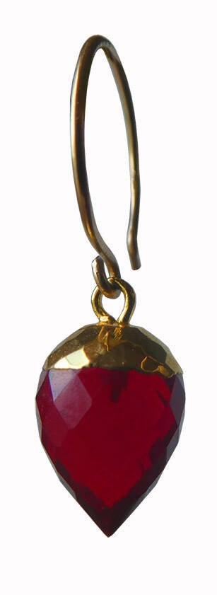 Minimale toevoeging voor maximaal effect. Dat krijg je als je deze bekoorbellen draagt. Granaat rood en gefacetteerd glanzen en glimmen je van louter plezier tegemoet met hun prachtige vergulde kapje en dat pittige puntje aan de onderkant. Ook de handgemaakte ronde haak heeft een mooi gouden laagje. Voor Apollonia's zijn ze kort, 3,4 cm, maar olala, wat n effect!