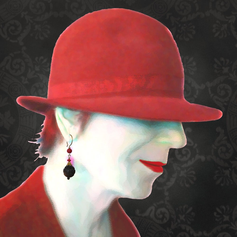 Daar kom je binnengevlogen... als een engel in de nacht. Warm, elegant en zacht en in volle pracht. Met heerlijke bellen aan je oren, rijk versiert en fijn gesneden. De zwarte blackwood kraal is een Tibetaanse OM mantrakraal. Daaronder een sappig, glad, rond onyxje en bovenop een rood koralen rondeltje. In het tussenstuk zit een prachtig rood liefdevol roosje van cinnabar. Alle metalen onderdelen zijn voorzien van een mooi laagje goud en de lengte van de bel is 5,6 cm.