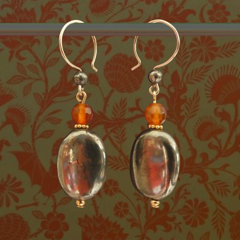 Ik droomde van pyriet: magisch, stoer, mysterieus, warm, oer, diep. De edelsteen pyriet roept associaties op die er niet om liegen, passend bij de kampvuurtjes die op mooie zomeravonden gestookt worden, bij het open haardvuur van warme winterse avonden en helemaal top bij een dinertje bij kaarslicht. De heerlijke glans van de ovale no-nonsens piriet en het ronde pyrietje on top hebben een facetgeslepen oranje agaatje in hun midden, die schittert als een twinkelende lach. De bel heeft een stoere handgemaakte haak die prachtig verguld is, net als de andere metalen onderdelen. Deze verrukkelijke oorbel is 5,3 cm lang.