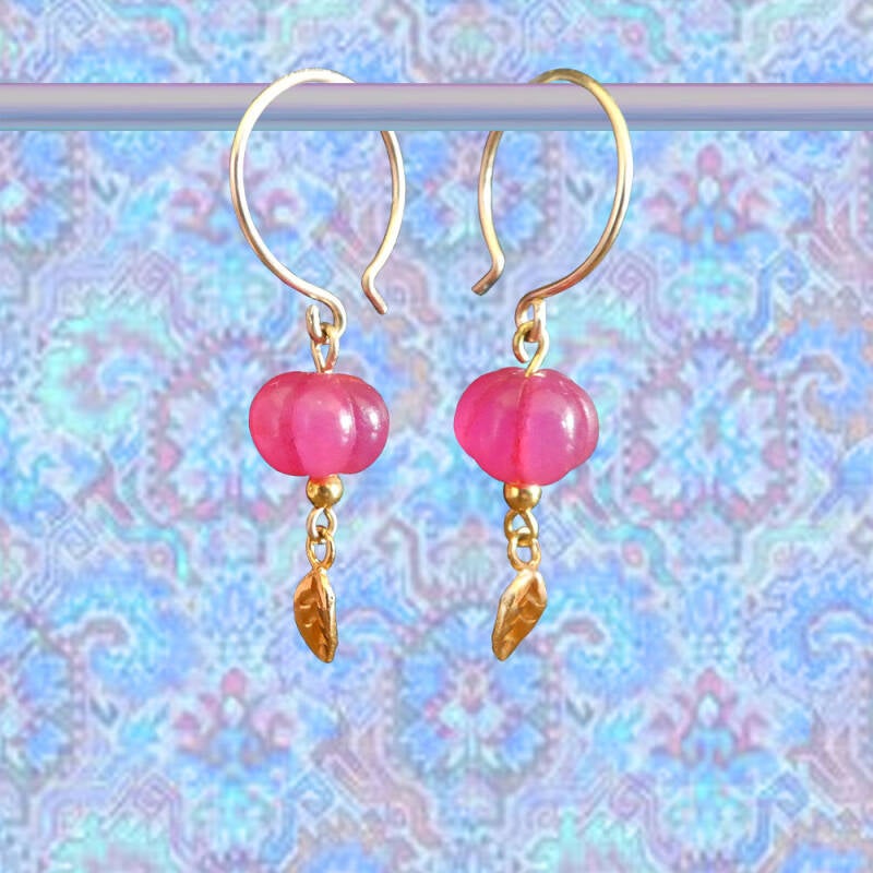 Een zoentje van een meloentje, dat is wat ApolloniaH dacht toen ze dit verrukkelijke bengeltje maakte. Zoet en sappig zien ze eruit, deze roze kwartzen die met de hand in de vorm van meloentjes zijn gesneden. Ze zijn klein, maar beslist ook fijn, fris en fruitig. Het pittige kleurtje straalt van ondeugendheid en heeft aan de onderkant een vermeil, 24K gouden kraaltje. Onderaan dit belletje bungelt een klein vermeil, eveneens 24K gouden veertje dat de vrije vrolijkheid compleet maakt. Het oorhaakje is handgemaakt en natuurlijk ook voorzien van een mooi laagje echt goud. De bel is in z'n totaliteit 3,9 cm 'lang'.