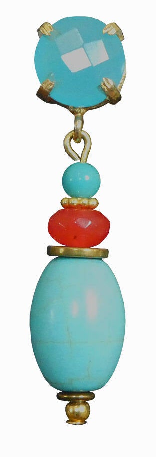 Hemelsblauwe bellen die een stoere, zelfbewuste engel niet zouden misstaan en waarmee je zeker niet om aandacht zult hoeven vragen. Degene die je met deze bellen voorbij ziet komen, zal zijn bezigheden beslist even vergeten, zo niet neerleggen, om je even goed te kunnen bekijken. En wat ziet hij dan? Een prachtige, zeeblauwe turkoois met een klein hematiet discje aan de onderkant en een iets groter, diepglanzend hematiet schijfje aan de bovenkant. Daarboven een lekker gefacetteerd rondeltje van intens rode jade en met on top een schat van - opnieuw - een turkooisje. In de vergulde steker is een steentje gevat van een gefacetteerde apatiet die je al van verre tegemoet schittert. Alle metalen onderdelen zijn voorzien van een mooi laagje goud en in het geheel is deze bel 4,2 cm lang. Vanaf het gaatje in je oor is hij met zijn 3,8 cm dus lekker draagbaar.