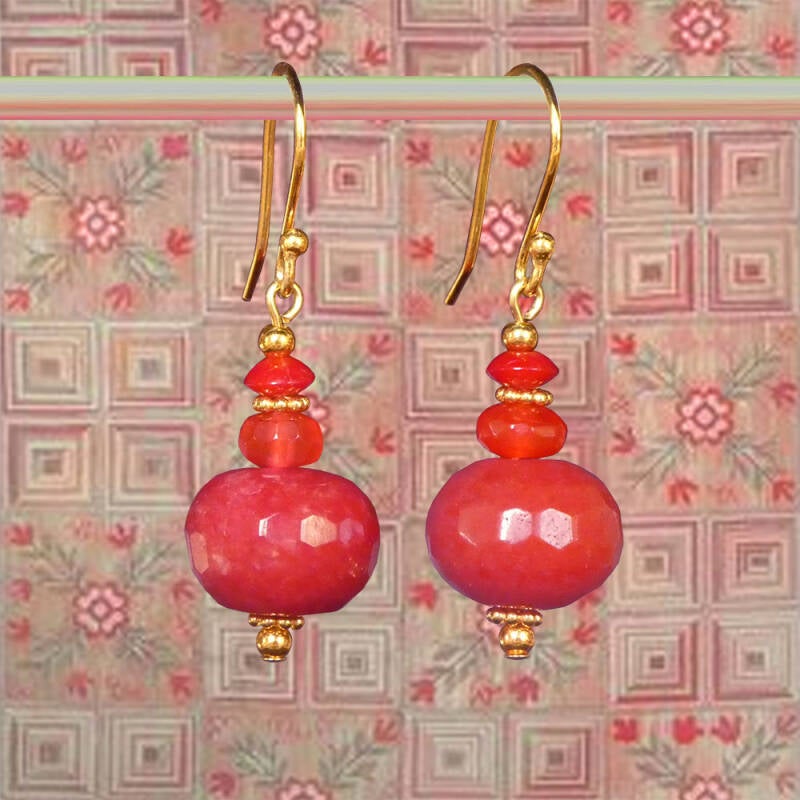 Miammie! Lekkere, sappige, zoete aardbeitjes, daar doen deze bellen beslist aan denken. Ze zijn van een verrukkelijke rode kleur facetgeslepen jade, zowel de grote als de kleine button. En bovenop, een sierlijke donut die aandoet als een wijs baretje: een rood koraaltje. De gouden kralen, spacertjes in bali-stijl en de haak zijn vermeil, dat wil zeggen dat de basis sterling zilver is en die is voorzien van een laagje 22 K goud. Dat geeft deze zomerkoninkjes die extra koninklijke uitstraling. De lengte van de bel is 4,1 cm.