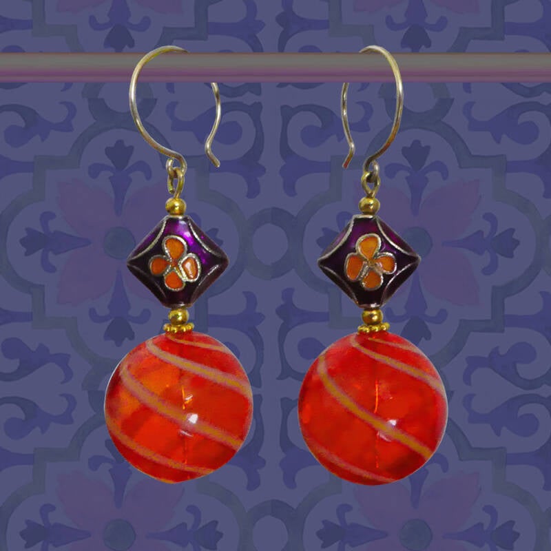 Hoeilaart heten ze, deze bellen. Dat is het Glazen Dorp. En dat is toepasselijk want die rode bolletjes met dat mooie spiraaltje dat er als het ware overheen gedrappeerd is, zijn holgeblazen glaskralen. Daardoor zijn deze bellen heerlijk licht en en van een prachtig, doorschijnend rood. Daarboven een kraal die gemaakt is door middel van een andere techniek: cloisonné. Dat is een manier van emailleren, waarbij een geplette draad de kleuren scheidt, en dan kunnen er dus van die leuke bloemetjes gemaakt worden. De stevige handgemaakte haak heeft een heel mooi echt gouden laagje, net zoals de andere metalen onderdelen. Het is een vrolijke, mooie pretbel die door zijn lichte gewicht en lengte van 5,3 cm heel draagbaar is.