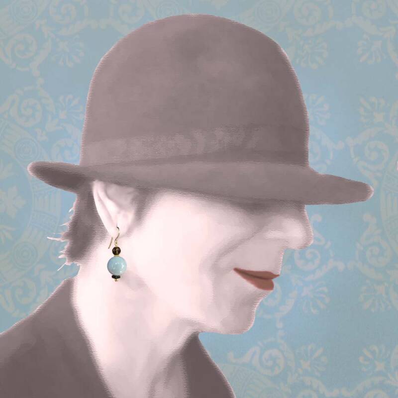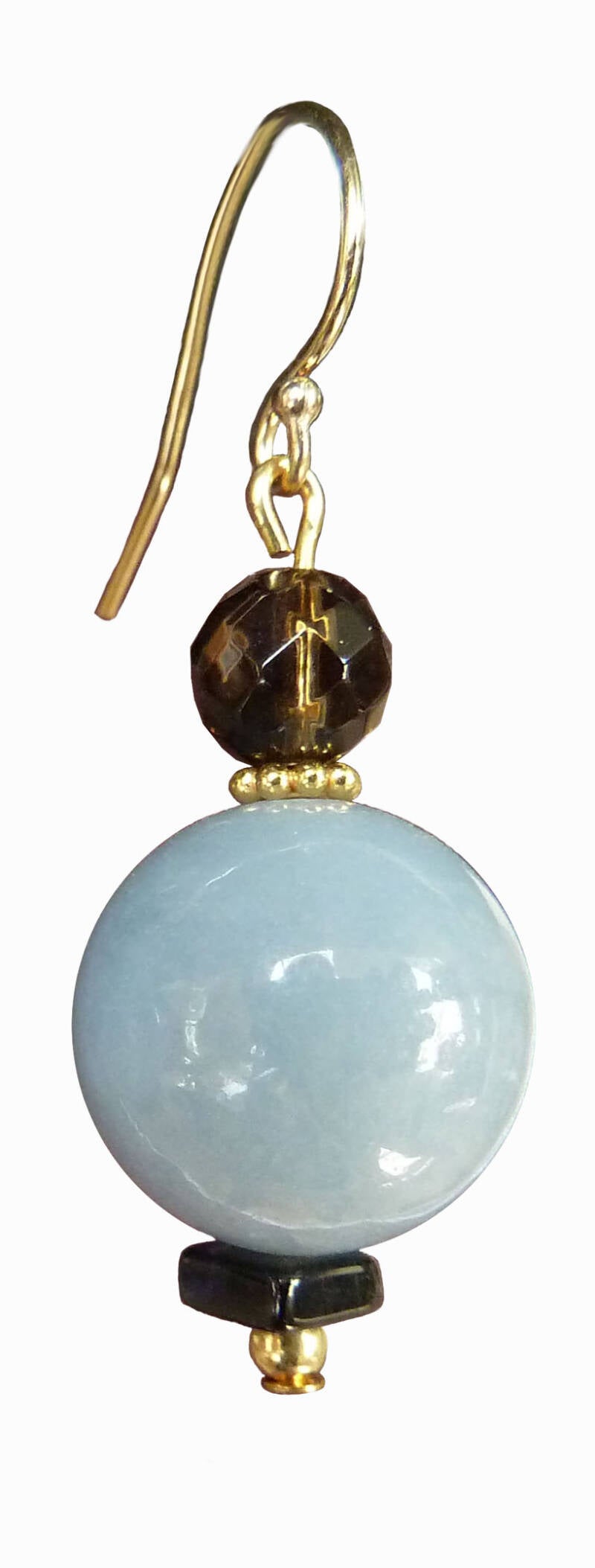 Icy door de angeliet die aandacht vraagt voor zijn perfecte vorm, maar ook mysterieus door de rookkwarts die door zijn facetten het licht vangt. En dan dat vierkante steentje van ioliet aan de onderkant... dat belooft wat. Alle metalen onderdelen zijn verguld en de lengte van de oorbel is 4 cm.