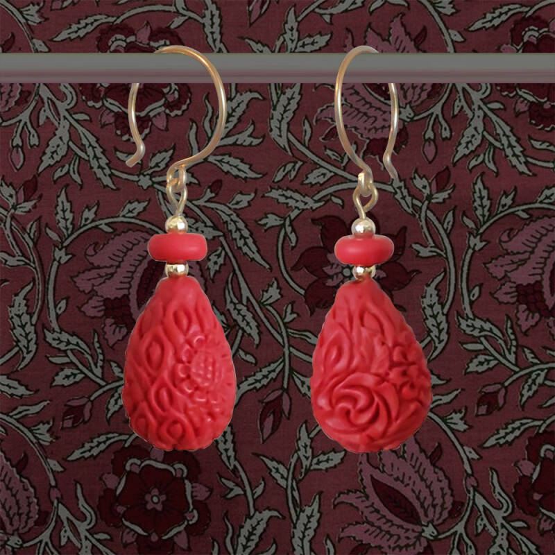 Simpel, kan je zeggen... Rode cinnabar met goud. Maar dan... kijk je goed. De kleur rood is van het volste, heerlijkste rood dat je kunt bedenken en de cinnabar is handgesneden in een bloemachtig patroon. Ook de 14K verguld gouden oorhaken zijn handgemaakt. De vermeil kraaltjes zijn van 24K goud over zilver.