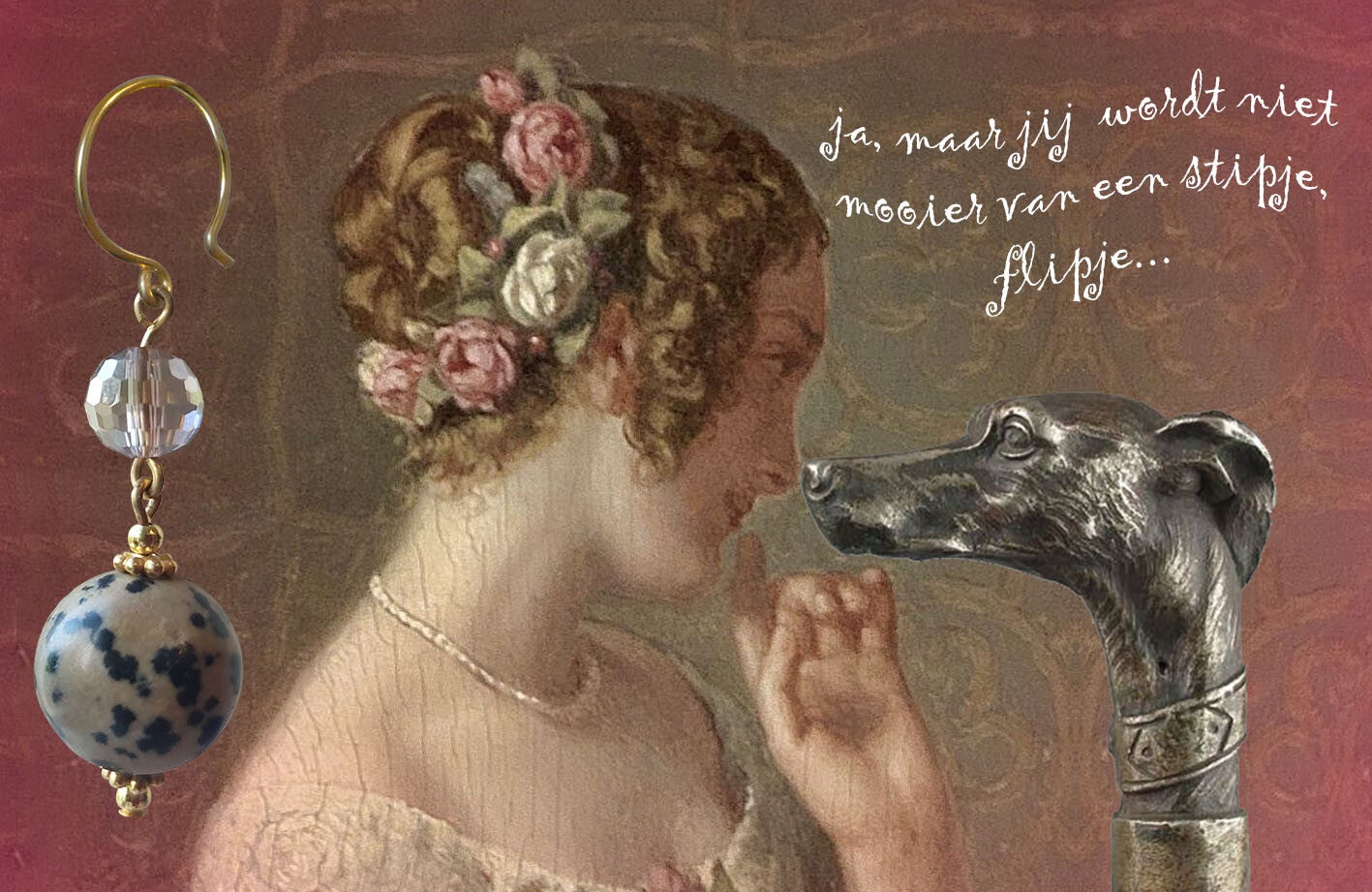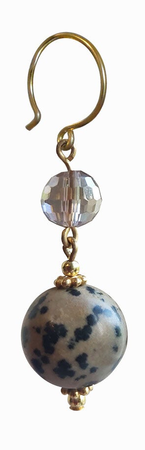 Niet alleen als je Dalmatiërs geweldige honden vindt, is deze bel een geweldige eye-catcher. Hij is inderdaad opvallend door die heel leuke, ronde, gestipte jaspis halfedelsteen, maar vlak die verrukkelijke, sprankelende, stralende, gefacetteerde kristal in het tussenstukje niet uit. Samen brengen, zeker door hun contrast, de wereld om je heel aan het wankelen. Nou ja, een beetje dan. Net leuk... De haak is handgemaakt en voorzien van een mooi laagje goud, net als de overige metalen onderdelen. En de lengte van de bel is 5,2 cm.
